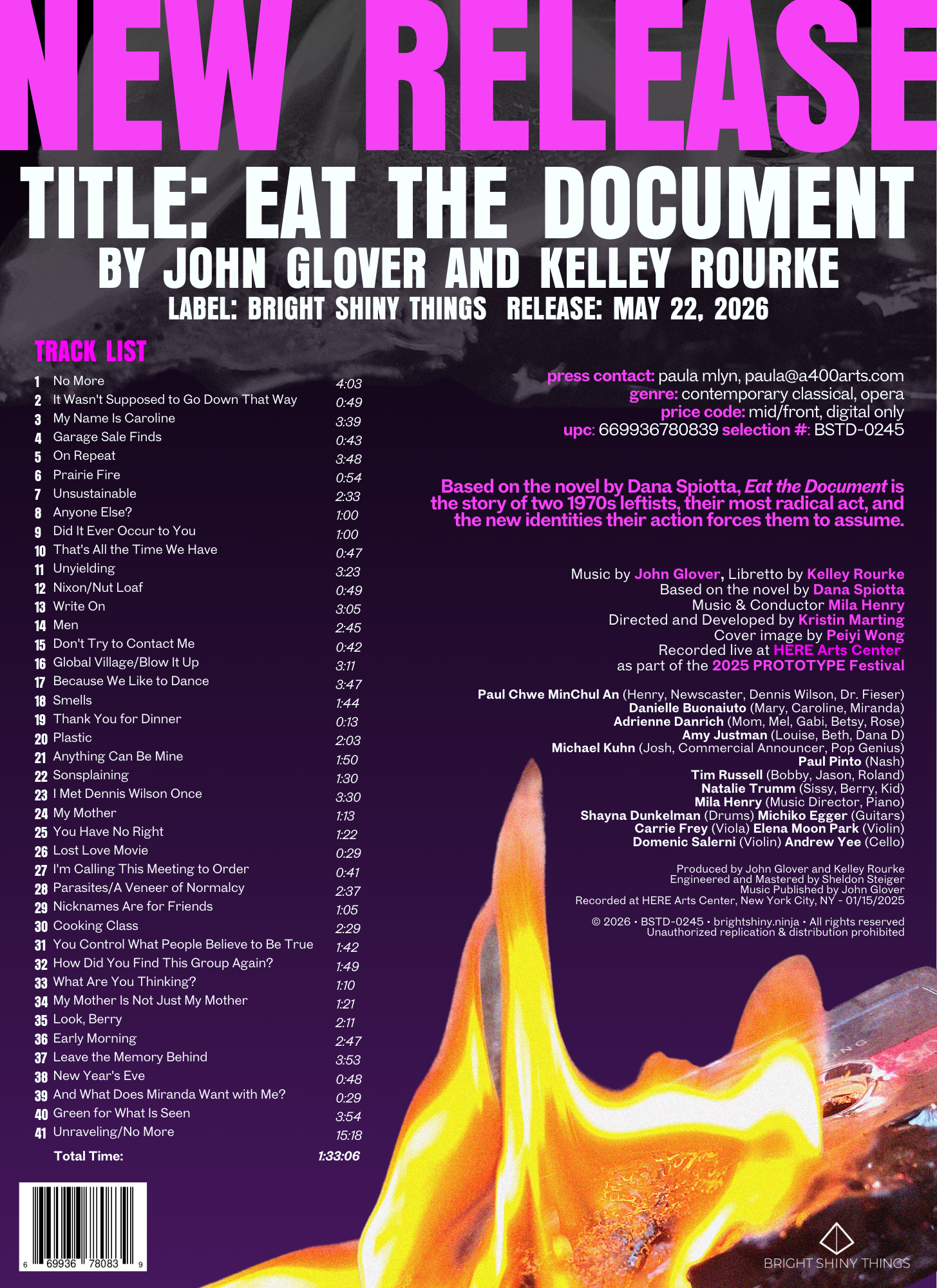 Based on the novel by Dana Spiotta, Eat the Document is the story of two 1970s leftists, their most radical act, and the new identities their action forces them to assume. Danielle Buonaiuto and Tim Russell play the young activists alongside Amy Justman and Paul Pinto, who play the same characters’ 1990s incarnations, exploring the connections between the two eras’ activism, language, technology, and music. Recorded live at HERE during the 2025 PROTOTYPE Festival, the work is by John Glover and Kelley Rourke, developed in collaboration with Mila Henry and Kristin Marting.